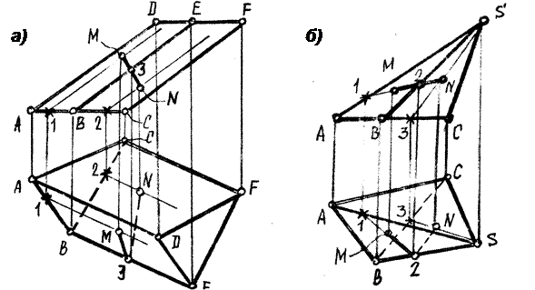 Так как поверхности гранные, то линии MN в обоих случаях будут ломаными и точки излома принадлежат ребрам поверхностей, с которыми линии MN пересекаются на видах спереди. Такими точками являются точки 3 (в примере «а») и 2(в примере «б»). Эти точки на видах сверху находятся просто – способом принадлежности.
