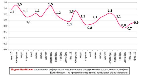 - сохраняется небольшой дефицит квалифицированных кадров – на февраль 2012 менее 1 резюме на 1 вакансию;