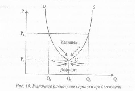 В графической модели рынка экономическое равновесие достигается в точке пересечения кривых спроса и предложения. Так, в точке С объем предложения Qs будет равен объему спроса QD, благодаря чему устанавливается цена равновесия Ре, одинаково удовлетворяющая как покупателей, так и продавцов (рис. 14).