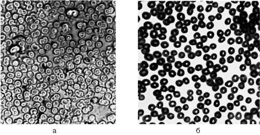 Рис. 5.7. Фотографии красных кровяных телец, полученные оптическим (а) и УЗ (б) микроскопами