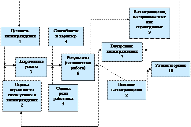 Достижение требуемого уровня результативности (6) может повлечь внутреннее вознаграждение (7), такие как чувство удовлетворения от выполненной работы, чувство компетентности и самоуважения, а также внешние вознаграждения (8): похвала руководителя, премия, продвижения по службе.