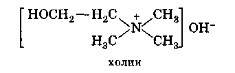 Холин. Он представляет собой четырехзамещенное аммониевое основание. В нем с атомом азота связаны три метильные и одна окси-этильная группа: