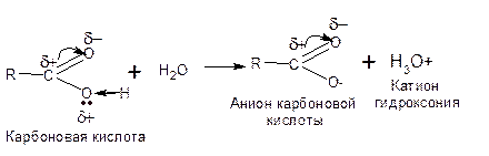В водном растворе карбоновая кислота диссоциирует с образованием аниона карбоксильной кислоты и катиона гидроксония (протона).