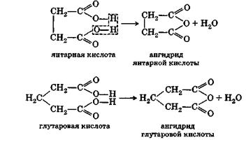 Двухосновные кислоты с четырьмя и пятью атомами углерода в молекуле, т. е. янтарная и глутаровая кислоты, при нагревании отщепляют элементы воды и дают внутренние циклические ангидриды: