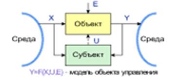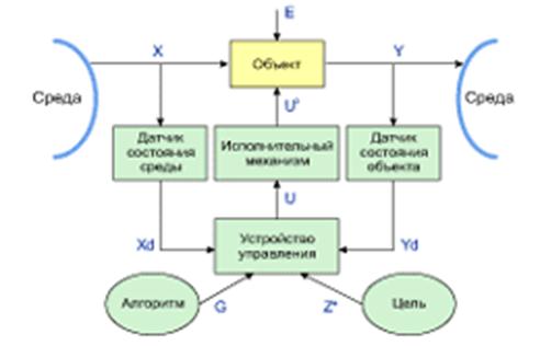 Для реализации целей субъекта служит устройство управления, которое с помощью алгоритма G вырабатывает необходимый сигнал управления U. При этом устройство управления использует текущую информацию о целях субъекта, состояние среды Xd и объекта управления Yd.