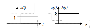 Этот сомножитель вводится для того, чтобы подчеркнуть, что h(t), является следствием приложения ко входу звена в момент времени t = 0 единичного скачка 1 (t), может существовать (не быть равной нулю) только при t ≥0. Для моментов времени t < 0, когда 1 (t) = 0, т.е. скачок еще не приложен, реакция на него h(t <0) равна нулю. Если на одном рис. 2.2 поместить рядом входной единичный сигнал x(t) = 1 (t) звена, и выходной z(t) = h(t) = k 1 (t), то легко понять, что параметр k, входящий в выражение для передаточной функции и в уравнение (2.1) есть коэффициент усиления безынерционного звена.