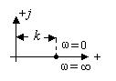 Амплитудно-фазовая характеристика безынерционного звена отличается тем, что для всех ее точек, соответствующих частотам от 0 до ∞, фазовый угол φ(ω) = const = 0 и АЧХ А(ω) = const = k, т.е. АФХ звена представляет собой точку на оси абсцисс плоскости Гаусса, отстающую от начала координат на расстояние k (рис. 2.4).