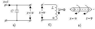 Примерами интегрирующих звеньев могут служить: электрическая емкость (рис.25 а); индуктивность (б); вращающийся вал (в), если за входной его сигнал считать угловую скорость вращения