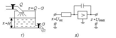 , а за входной сигнал – угол поворота вала φ; гидравлический резервуар (г); операционный усилитель в режиме интегрирования (д).