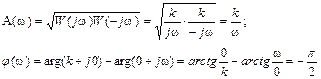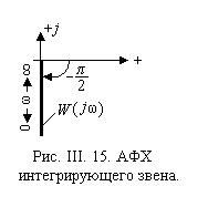 АФХ интегрирующего звена (рис. 2.15) построена на основании зависимостей A(ω) и φ(ω). Подчеркнем, что для всех частот 0 ≤ ω < ∞, фазовый угол звена равен