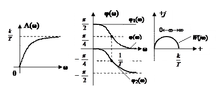 На рис. 30 построены эти зависимости. На этом же рисунке, по значениям A(ω) и φ(ω) получена АФХ звена W (j ω ), которая проходит по положительной полуоси ординат. Это обусловлено тем обстоятельством, что для любой частоты 0 ≤