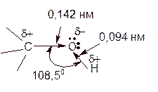 Свойства спиртов определяется строением гидроксильной группы, характером ее химических связей, строение углеводородных радикалов и их взаимным влиянием. Связи О–Н и С–О – полярные ковалентные. Электроотрицательность атома кислорода (3,5), водорода (2,1), углерода (2,4). Электронная плотность обеих связей смещена к наиболее электроотрицательному атому кислорода. Атому кислорода в спиртах свойственна Sp3–гибридизация. В образовании его связей С и Н участвуют Sp3–атомные орбитали, валентный угол С–О–Н близок к тетраэдрическому (около 108,50). Каждая из двух Sp3–АО кислорода занята неподеленной парой электронов.
