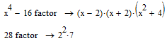 Разложение выражений на простые множители производится при помощи команды Symbolic→Factor (Символика→Разложить на множители) либо использованием вместе с оператором символьного вывода ключевого слова factor. Эта операция позволяет разложить полиномы на произведение более простых полиномов, а целые числа – на простые сомножители. Применяя команду меню, не забывайте перед ее вызовом выделить все выражения или его часть, которую планируете разложить на множители.