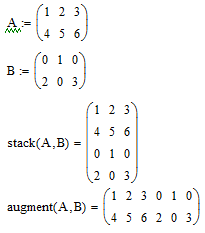 Для того, чтобы составить из двух и более матриц одну, в Mathcad предусмотрены две матричные функции: