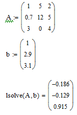 lsolve(A, b) – решение системы линейных уравнений, где A – матрица коэффициентов системы; b – вектор правых частей.