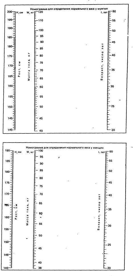 Кандидат медицинских наук В.Гришко и доктор технических наук С.Борисов разработали номограммы для определения нормального веса. За точку отсчёта взят возраст 23 года. В этом возрасте заканчивается физиологический рост организма. И нужно стремиться к тому, чтобы в дальнейшем поддерживать этот вес, который для 23-летнего возраста считается нормальным, а для более старшего - идеальным.
