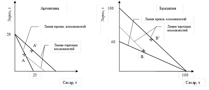 Еще больший выигрыш получает страна от специализации на производстве того товара, по которому обладает абсолютным преимуществом (на графике жирная линия торговых возможностей). В этом случае обе страны могут увеличить объемы потребления и зерна, и сахара (например, точка А' для Аргентины и точка В' для Бразилии). Это можно показать на простом цифровом примере (таблица 2.1).
