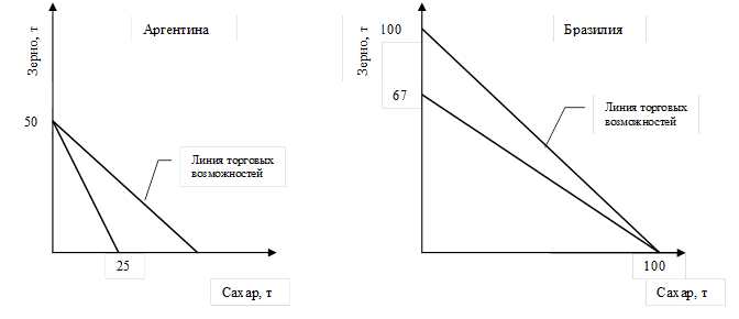 Аргентине производство зерна обходится дешевле, чем Бразилии. Таким образом, по зерну Аргентина обладает сравнительным преимуществом и может его экспортировать в обмен на сахар. В свою очередь, Бразилии будет выгодно экспортировать сахар, и импортировать зерно.