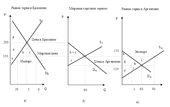 Кривые спроса на зерно (DА в Аргентине и DБ в Бразилии), показывающие соотношение между объемом спроса и уровнем цен, определяются вкусами и предпочтениями потребителей при данном уровне дохода. Предположим, что при отсутствии внешней торговли характеристики спроса и предложения таковы, что равновесие на рынке зерна (пересечение кривых спроса и предложения) в Аргентине устанавливается при цене 120 долл. за 1 т, а в Бразилии - при цене 200 долл. за 1 т.