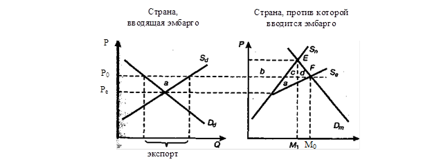В условиях свободной торговли равновесие устанавливается в точке F при цене Р0. После введения эмбарго кривая Se исчезает и предложение импортной продукции представлено только кривой Sn. В стране, вводящей эмбарго, цена падает (поскольку теперь больше продукции реализуется на внутреннем рынке), а в стране, против которой эмбарго вводится, цена, наоборот, растёт и объём импорта сокращается до М1. Изменение внутреннего равновесия (переход из точки F в точку Е) приводит к следующим результатам: (область а – потери страны, вводящей эмбарго; область (b + c + d) – потери страны, против которой вводится эмбарго; область b – выигрыш остальных стран; область (a + c + d) – общие потери от введения эмбарго.