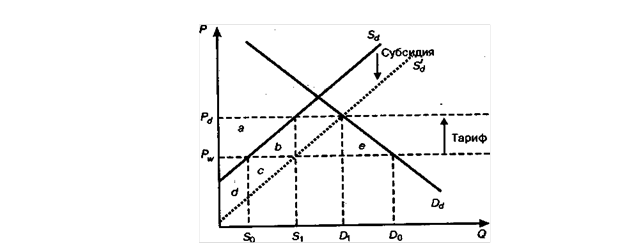 Однако существо проблемы заключается в том, что отечественное производство нуждается в защите в силу своей недостаточной эффективности, и политика протекционизма, ограничивая конкуренцию, создает условия для сохранения такого положения. Кроме того, хотя импорт сокращает занятость в импортозамещающих отраслях, но одновременно он создает и новую занятость (связанную, например, с закупкой, продажей, послепродажным обслуживанием импортной продукции). Наконец, государство может обеспечить поддержку отечественных производителей и ее эффективным, чем протекционизм, методом, с меньшими потерями для благосостояния общества. На рисунке 4.10 показаны в сравнении последствия установления таможенного тарифа и предоставления эквивалентной субсидии производителям. Если сохраняется режим свободной внешней торговли и производители получают субсидию, то увеличение отечественного производства достигается без повышения цен и, следовательно, потребители потерь не несут. Выигрыш производителей составляет область (с + d), а затраты государства на субсидию - область (а + b) = (b + с + d). Таким образом, общие потери от предоставления субсидии составят область b, тогда как потери от введения тарифа больше и составляют область (b + е).