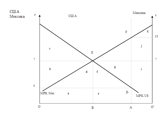 На графике по горизонтальной оси откладывается объем инвестированного в двух странах капитала, а по вертикальным осям — уровень дохода на вложенный капитал (процентная ставка r). Совокупный капитал в двух странах составляет величину ОО'. Кривые MPKus и MPKMex показывают динамику предельной производительности капитала, определяющей величину спроса на капитал: по мере увеличения запаса капитала величина предельного продукта сокращается и, следовательно, снижается уровень дохода на вложенный капитал. Соответственно площадь под кривыми предельной производительности капитала показывает объем производимой продукции при разной величине инвестированного капитала.