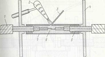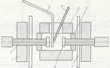 / _ жила кабеля. 2- горелка; 3-палочка припоя. 4 - тепловые экраны; 5 — асбестовая подмотка. 6 - рас плавленный припой, 7 - форма