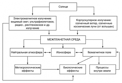 Схема солнечно-земных связей включает в себя электромагнитное и корпускулярное излучение. Оба вида излучения обусловливают ряд процессов и явлений во всех геосферах (в частности, полярные сияния, магнитные бури и связанные с ними последствия).