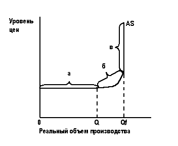 При достижении реального объема производства на кривой СП наблюдается перелом. Экономика приближается к состоянию полной занятости. Т.к. в различных отраслях этот процесс наступает не одновременно, то идет перераспределение ресурсов, что связано с увеличением затрат на единицу ресурсов труда. Показатель загрузки мощностей достигает своей критической точки, и в ход идут менее производительные ресурсы, которые прежде не использовались. Наблюдается повышение средних издержек производства товаров и услуг. Поэтому, чтобы объемы производства увеличились за пределами отрезка (0Q), необходимо соответствующие компенсирующие повышения уровня цен. Этот отрезок кривой СП получил название восходящего, ил промежуточного (б). Он отражает прямой характер зависимости между уровнем цен и объемом производства.