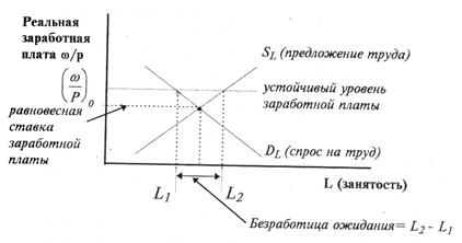 2) Устойчивость (жесткость) заработной платы порождает "безработицу ожидания". Безработица ожидания возникает в результате превышения уровня реальной заработной платы над ее равновесным значением (см. рис.).