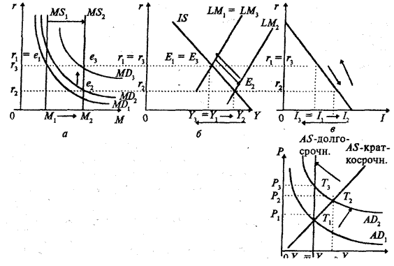 Этот рост цен вызывает дальнейшее смещение кривой спроса на деньги МD на денежном рынке (рис.25, а) вдоль кривой денежного предложения МS2, из положения МD1 в положение МD2 Равновесие устанавливается в точке e3. Это вызывает увеличение процентной ставки с г2, до r3. Рост цен сдвигает кривую LМ2 вверх до положения LM3, точка равновесия в модели 1S - LМ устанавливается в Е3. Реальные плановые инвестиции, которые увеличиваются, когда процентная ставка падала, уменьшаются вновь при росте процентной ставки с r1 до r3 и возвращаются к начальному уровню.