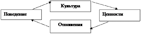Различают два пути влияния культуры на организационную жизнь и ее эффективность (результативность функционирования системы управления и самого процесса воздействия субъекта на управляемый объект). Первый путь – культура и поведение взаимно влияют друг на друга. Каждая группа может быть охарактеризована с точки зрения ее культурной ориентации, которая отражает сложное цикличное взаимодействие ценностей, отношений и поведения членов группы (см. рисунок 6).