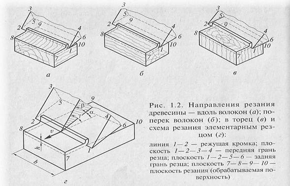 Резание характеризуется направлением движения резца по отношению к волокнам древесины, толщиной стружки, её шириной, а так же скоростью резания.
