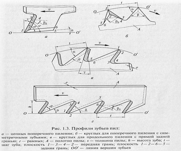 У зуба пилы различают три режущие кромки, каждая из граней зуба должна быть направлена под таким углом к обрабатываемой поверхности, который обеспечивал бы наименьшую величину усилия резания надлежащую прочность зуба и хорошее качество поверхности резания. Угловые величины зуба зависят от назначения пилы. Боковые и передние кромки 1-3 формируют боковые плоскости пропила, короткие режущие кромки 1-2 образуют дно пропила. В поперечных пилах боковые режущие кромки производят резание в торец и преодолевают большое сопротивление по сравнению с короткой кромкой.