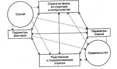 На систему детерминантов существенное влияние оказывают два фактора – случай (крупное изобретение, внезапные события, влияющие на положение страны и т.п.) и политика правительства. Последняя может усилить конкурентное преимущество экономики страны, ослабить его, быть единственным источником национальных конкурентных преимуществ.