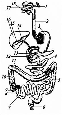 Пищеварительный тракт состоит из следующих отделов: ротовая полость, глотка, пищевод, желудок, двенадцатиперстная кишка, тонкий кишечник, толстый кишечник.