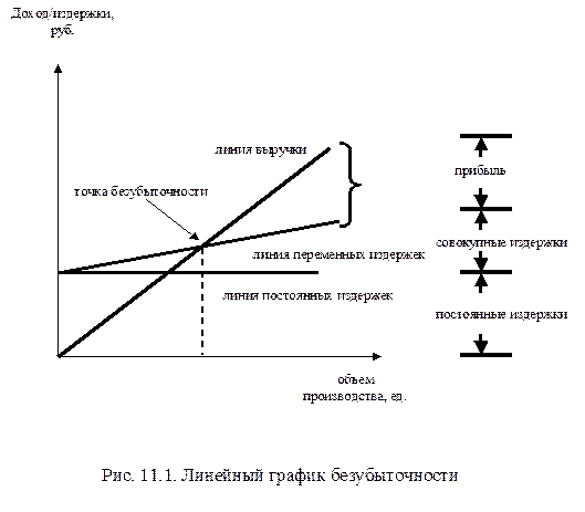 СПРАВКА. На практике существует множество точек безубыточности, что объясняется несовершенством рынков. С ростом объема производства и продаж предприятие может быть вынуждена уменьшать цену продажи, а возможна ситуация, когда с ростом объемов увеличиваются цены факторов производства (сырье и материалы, труд, капитал), например, из-за необходимости оплачивать сверхурочную работу. Эта нелинейность или цены, или функции издержек либо их обеих объясняет существование нелинейных графиков безубыточности. Линейность кривой продаж означает, что рынок сбыта продукции предприятия совершенен. Линейность кривой суммарных издержек говорит о том, что цены материальных и трудовых ресурсов постоянны, и такова же природа экономии на масштабах производства. Если условия соблюдаются, то мы имеем линейный безубыточности (рис. 11.1).
