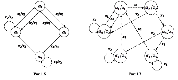 Примеры графов автоматов Мили и Мура приведены на рисунках 1.6 и 1.7 соответственно.