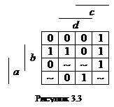 Если картой Карно задана не полностью определенная логическая функция, то в клетках карты, кроме единиц, соответствующих рабочим наборам (единичным значениям) функции, и нулей, соответствующих запрещенным наборам (нулевым значениям), проставляются знаки ~, соответствующие условным наборам (условным значениям) функции (см. рисунок 3.3).