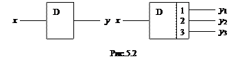 Элемент задержки (задержка) – это устройство, предназначенное для задержки проходящих через него сигналов на некоторое время t, определяемое параметрами элемента. На рисунке 5.2 приведены условные графические обозначения элементов задержки (D -триггер) с одним и несколькими выходами. Цифры, стоящие возле выходов на дополнительном поле, являются условными обозначениями величины задержки сигнала на каждом из выходов.