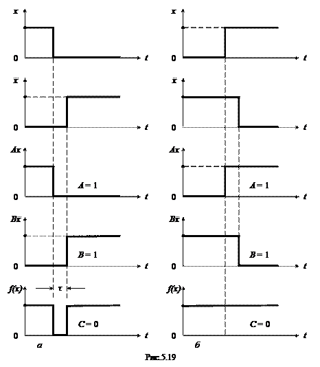 Временные диаграммы, показывающие характер изменения сигнала ДУ в рассматриваемом случае, представлены на рисунке 5.19, а. На рисунке 5.19, б приведены временные диаграммы, соответствующие изменению сигнала x = (0 → 1) при тех же значениях A, B, C. Как следует из графиков, нарушений выходного сигнала ДУ не происходит, потому что при x =