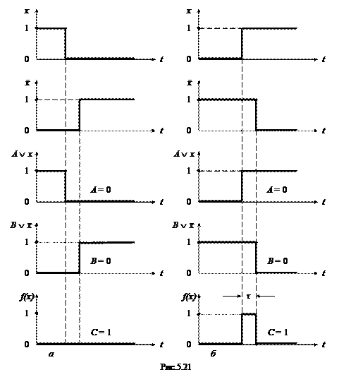 Временные диаграммы, показывающие характер изменения сигналов в рассмотренном случае, представлены на рисунке 5.21, б. На рисунке 5.21, а приведены диаграммы, соответствующие изменению сигнала x = (1 → 0). Видно, что в этом случае неправильный выходной сигнал на выходе ДУ не появляется. Это объясняется тем, что при x =