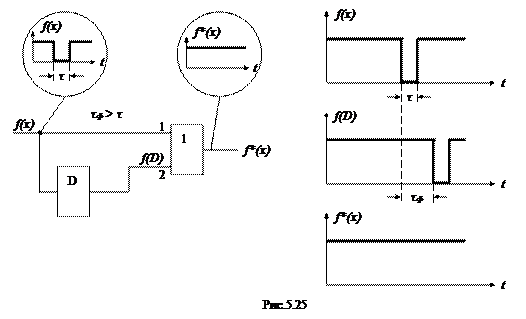 Фильтр состоит из линии задержки D и логического элемента ИЛИ. Если выходной сигнал ДУ f (x) из-за состязаний типа риск в единице исчезнет на время τ, то единичный выходной сигнал f *(x) на выходе фильтра обеспечивается схемой ИЛИ и единичным выходным сигналом на задержке D. Если же выходной сигнал ДУ f (x) изменится с 1 на 0, то через время τФ выходной сигнал задержки D станет равным 0, вследствие чего и сигнал f *(x) на выходе фильтра тоже станет равным 0.