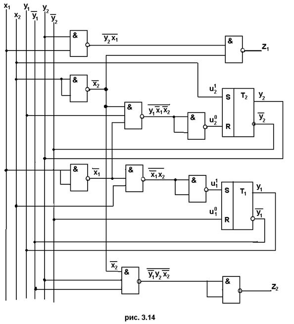Произведем структурный синтез ДУ по условиям функционирования, полученным в примере 3.2, имея в виду, что в качестве элементов памяти используются триггеры с раздельными входами.