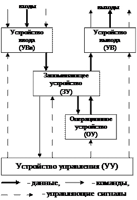 Такой сложный программный автомат (например, АСКУ, ЭВМ и др.) можно разделить на 5 функционально различных частей (Рисунок 4.1): устройство ввода (УВв), запоминающее устройство (ЗУ), операционное устройство (ОУ), устройство вывода (УВ), устройство управления (УУ).