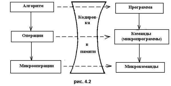 Операциям алгоритма соответствуют команды в автомате, микрооперациям – микрокоманды (Рисунок 4.2). Последовательность команд образует программу работы автомата. Эта программа и есть реализация соответствующего алгоритма в программном автомате.