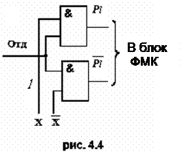 Блок ПЛУ служит для проверки логических условий. Он представляет собой совокупность логических узлов, каждый из которых проверяет определенное логическое условие. На рисунке 4.4 представлена схема логического узла. Эта схема проверяет логическое условие x. Если x =1, то по микрокоманде l формируется управляющий сигнал в цепи Pl и по ней подается в формирователь микрокоманд. Если x =0 (