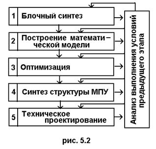 Разделение процесса синтеза МПУ на указанные этапы является условным, хотя и позволяет облегчить решение задачи синтеза. Этапы синтеза между собой тесно связаны. Если какие-либо требования к МПУ на том или ином этапе не выполняются, то необходимо возвратиться к предыдущим этапам с целью проведения анализа и ликвидации противоречий, уточнения принятых решений и удовлетворения этих требований.