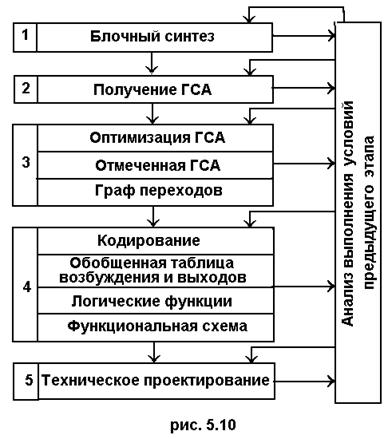 На первом этапе проводится блочный синтез сложного автомата, в процессе которого из его структуры выделяется блок управления, реализуемый впоследствии в виде МПУ.