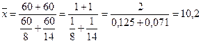 Для иллюстрации области ее применения воспользуемся упрощенным условным примером. Предположим, в фирме, специализирующейся на торговле по почте на основе предварительных заказов, упаковкой и отправкой товаров занимаются два работника. Первый из них на обработку одного заказа затрачивает 8 мин., второй – 14 мин. Каковы средние затраты времени на 1 заказ, если общая продолжительность рабочего времени у работников равна?